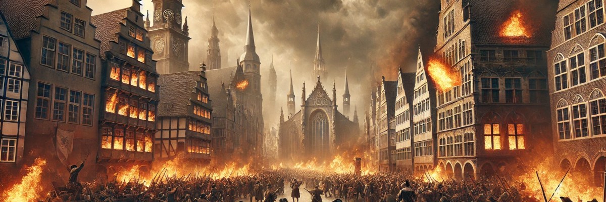 A finales de la década de 1520, después de la primera ola de iconoclasia de la Reforma, en la cual muchas imágenes religiosas fueron destruidas como símbolo del rechazo a las prácticas católicas, y en un contexto de gran angustia social debido a la inestabilidad económica y la persecución religiosa, los anabaptistas radicales en las ciudades estado de Holanda y el noroeste de Alemania revivieron ideas revolucionarias de tiempos anteriores, tales como la abolición de la propiedad privada, la creación de comunidades comunales, y la instauración de un orden social basado en la igualdad religiosa y económica. Este resurgimiento ocurrió en un momento de agitación extrema, marcado por tensiones religiosas y un profundo descontento social.