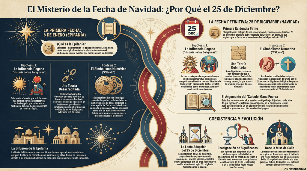 El viaje desde la indiferencia inicial, pasando por las celebraciones del 6 de enero en Oriente y los cálculos simbólicos en Occidente, hasta la lenta adopción del 25 de diciembre, nos muestra que la tradición es algo vivo y en constante construcción. La fecha no es tanto una certeza histórica como un símbolo nacido de siglos de reflexión y fe.