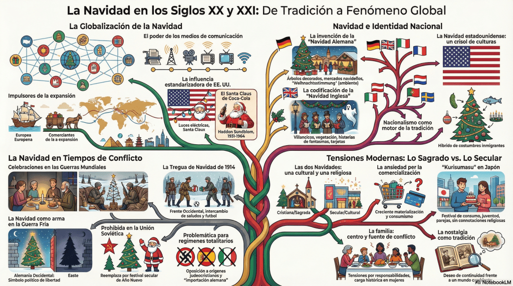Pero, ¿y si esa imagen de una Navidad eterna y apolítica fuera, en gran medida, una construcción moderna? ¿Y si muchas de nuestras tradiciones más queridas no fueran tan antiguas como creemos, sino invenciones relativamente recientes, forjadas en el crisol del nacionalismo, la guerra y el poder imperial? La historia reciente de la Navidad, la de los siglos XX y XXI, no es un cuento de hadas sereno. Es una narrativa fascinante y a menudo conflictiva, llena de batallas culturales, propaganda política, globalización acelerada y una profunda ansiedad sobre su verdadero significado.