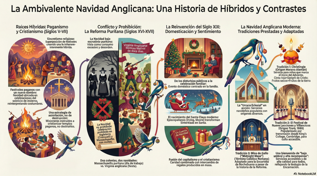¿Cómo pudo una festividad con orígenes tan conflictivos —una mezcla de paganismo, disturbios sociales, prohibiciones religiosas e invenciones modernas— convertirse en el fenómeno global que es hoy? Parte de la respuesta se encuentra en la naturaleza única de la denominación que fue su principal vehículo de exportación: el anglicanismo. La Iglesia de Inglaterra posee una característica que la hizo perfecta para difundir una festividad tan inherentemente híbrida como la Navidad.